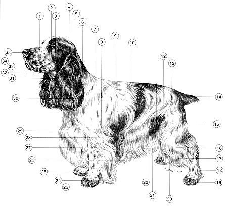Perro alegre, deportista, atento,corto y compacto, sustancioso, de aspecto robusto, con medida del suelo a la cruz aproximadamente igual a la que hay entre la cruz y la ra�z de la cola (38-39 cm. para la hembra y 39-41 cm. para los machos). La construcci�n arm�nica y bien equilibrada, apoyada en una robusta osamenta, accionada por musculatura bien desarrollada, es la de un perro id�neo para una actividad venatoria que se desarrolla en terreno d�ficil, d�nde se requiere sustancia f�sica, unida a agilidad. La armon�a de sus partes confiere a este peque�o gran spaniel una nota de distinci�n y clase.